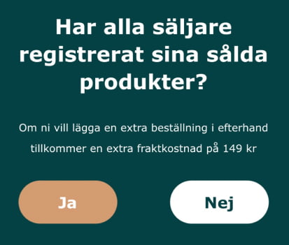 3. Efter att ni har klickat på ”Avsluta försäljning” dyker det upp ett meddelande som frågar om alla säljare har registrerat sina sålda produkter. Ni kan klicka ”Ja” på denna om ni har kontrollerat att alla beställningar är registrerade.