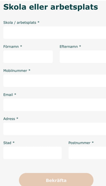 6. I nästa steg skriver ni in leveransadressen. Om ni har valt att få beställningen levererad till en skola/arbetsplats så är skolans eller arbetsplatsens adress ni fyller i nedanför. Om ni har valt att få beställningen levererad till en privatadress så är det den adressen ni fyller i. Dubbelkolla att alla uppgifter stämmer och klicka sedan på ”Bekräfta”.